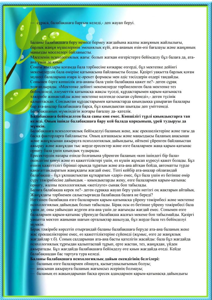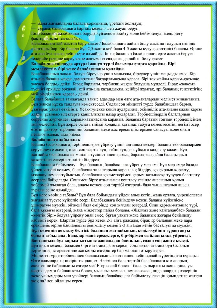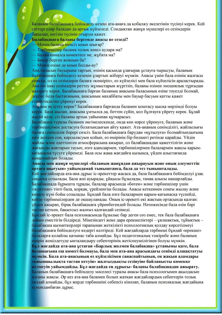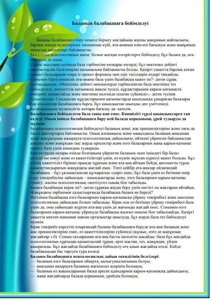 БАЛАНЫҢ БАЛАБАҚШАҒА БЕЙІМДЕЛУІ
